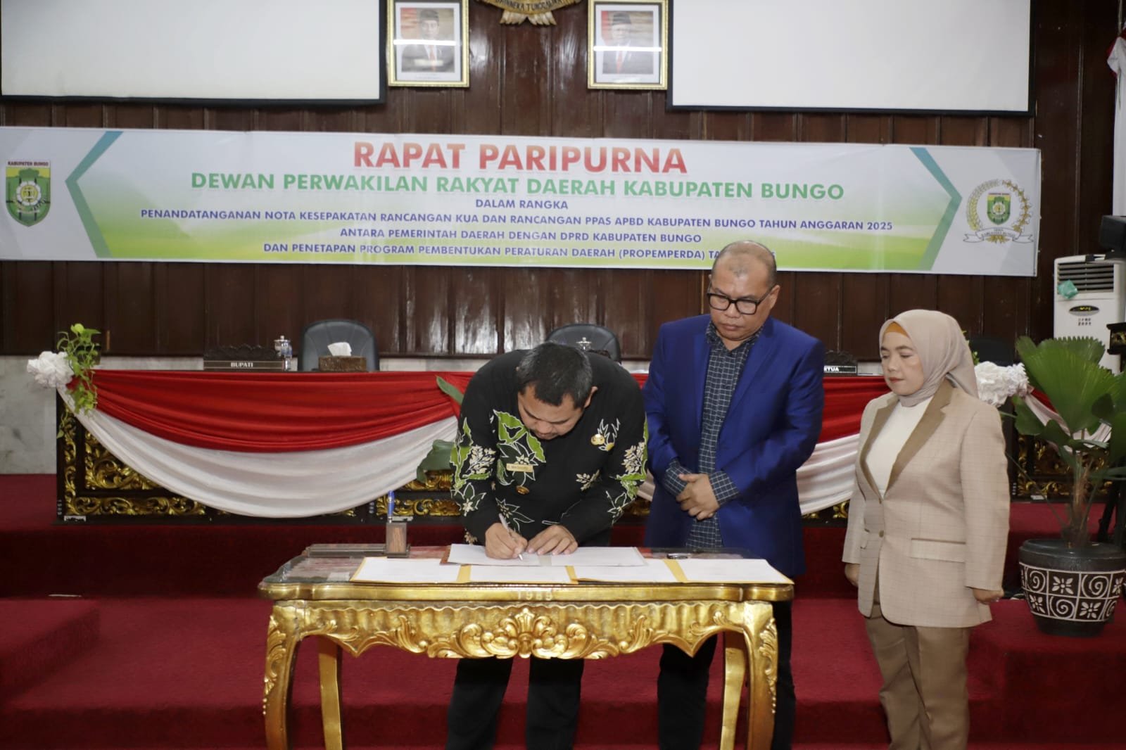 Bupati Bungo H.Mashuri.SP.ME menandatangani nota kesepakatan rancangan KUA dan rancangan PPAS tahun anggaran 2025. Acara penandatanganan itu berlangsung di ruang paripurna DPRD Kabupaten Bungo.
