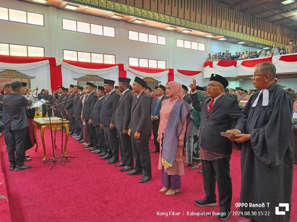 Pengucapan sumpah janji anggota DPRD Kabupaten Bungo masa jabatan 2024-2029 yang berlangsung di Gedung Paripurna DPRD Bungo, Jum’at siang (30/8/2024).